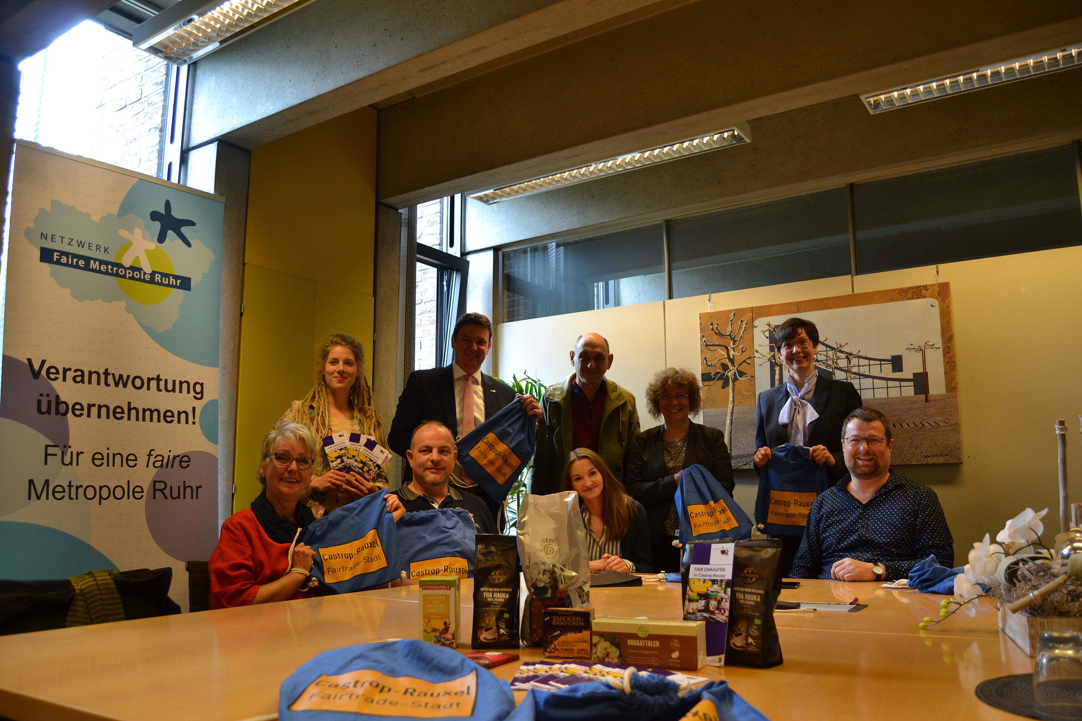 Für das 10-jährige Jubiläum hat das Netzwerk Faire Metropole Ruhr rund 300 Exemplare eines Fairen Turnbeutels für Castrop-Rauxeler Neubürgerinnen und Neubürger bereitgestellt. Am Freitag, 10. Mai, übergab Markus Heißler vom Eine Welt Zentrum des Kirchenkreises und Sprecher des Netzwerkes der Fairen Metropole Ruhr, die Beutel Bürgermeister Rajko Kravanja. Sie werden ab sofort im Bürgerbüro an Neu-Castrop-Rauxeler verteilt. Mit dem Turnbeutel sollen gerade Neubürger auf das Thema aufmerksam gemacht und der Einstieg zum fairen und bewussten Einkaufen in der neuen Wohnstadt erleichtert werden.