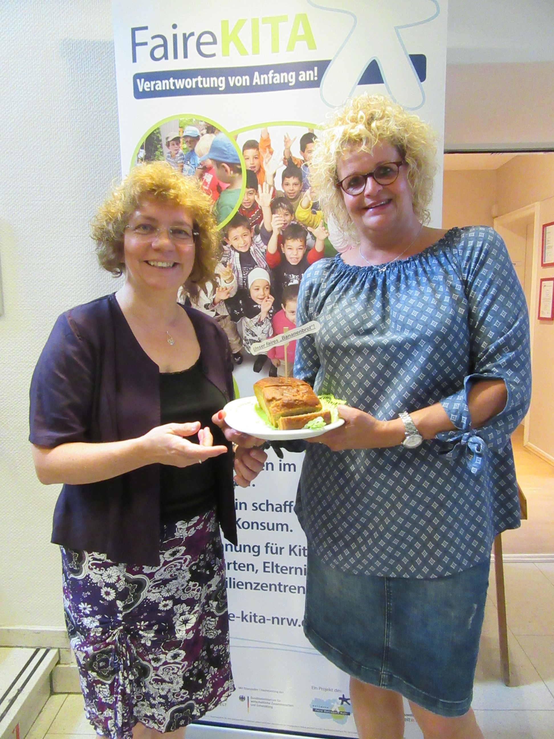 In Kooperation mit der Fachstelle FAIRE KiTA in Dortmund nahm Petra Stach-Wittekind vom Eine-Welt-Zentrum Herne eine der ersten Re-Zertifizierungen vor. Die Katholische KiTa St. Elisabeth in Bottrop hatte sich nach drei Jahren zur Titelerneuerung beworben und feierte diese bei einer Soli-Brot-Aktion mit den Eltern und Kindern ihrer Einrichtung. Andrea Bert, die Leiterin der KiTa, nahm stellvertretend für das gesamte Team die Urkunde und das neue Türschild in Empfang. Die Kinder hatten Brötchen und Bananenbrot gebacken und gaben es gegen eine Spende für Misereor weiter. „Das Thema „Fairer Handel“ gehört in unserer Einrichtung inzwischen ganz normal und selbstverständlich zum Programm“, so eine Mitarbeiterin der KiTa, „mit viel Freude haben die Kinder sich mit der Herkunft der Schokolade und anderen Themen beschäftigt.“