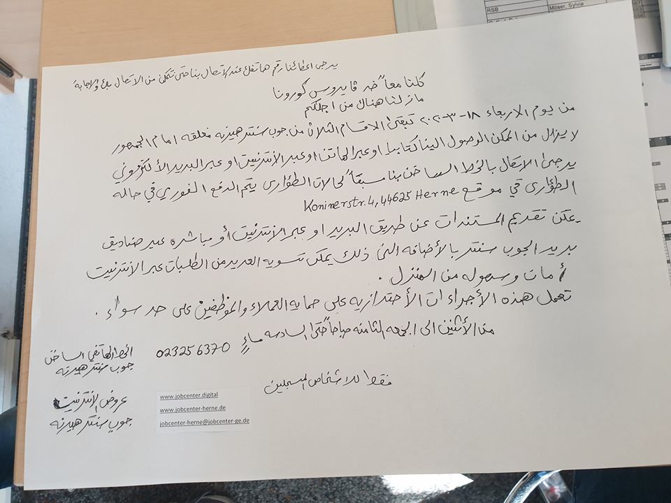 في الوقت الحالي تلغى جميع مواعيد مركز العمل الجوبسينتر "Jobcenter" و وكالة العمل "Agentur für Arbeit", لا يجب عليكم الخوف من العقوبات بسبب المواعيد الملغاة.