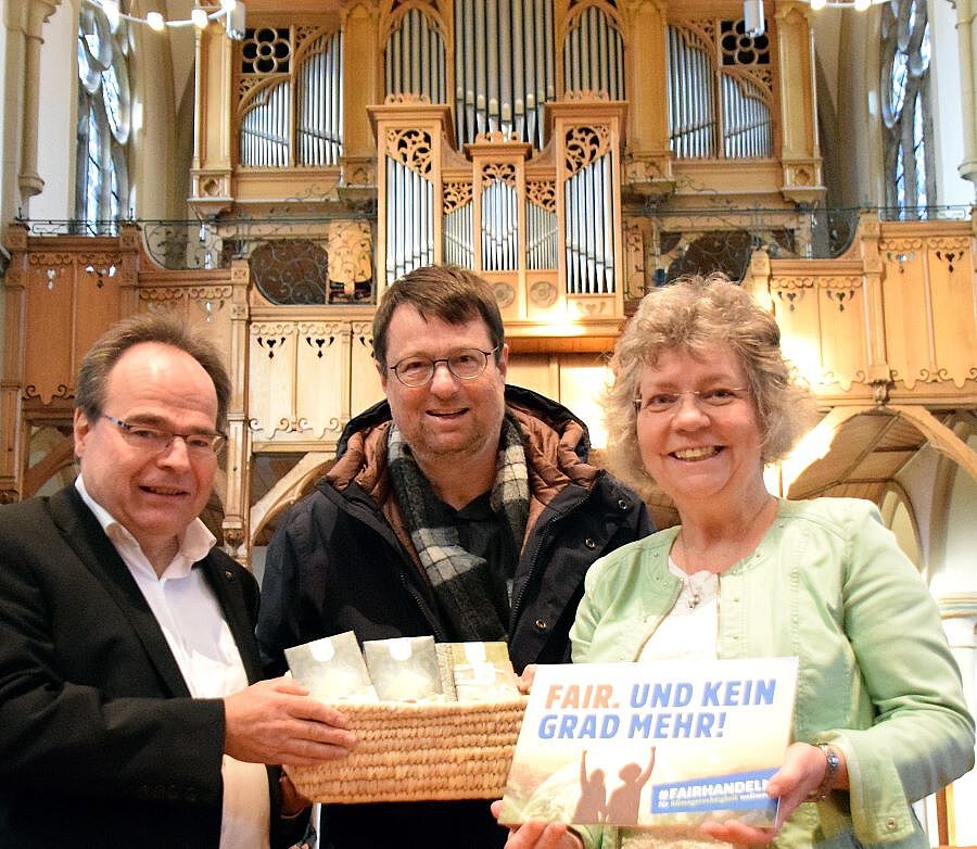 In seiner Predigt aktualisierte Leising ein Zitat des ehemaligen Bundeskanzler Willy Brandt. Aus „Der Frieden ist nicht alles, aber alles ist ohne den Frieden nichts“ machte er „Klimagerechtigkeit ist nicht alles, aber alles ist ohne Klimagerechtigkeit nichts“, womit der Theologe den Titel der Fairen Woche („Fair. Und kein Grad mehr“) in den Mittelpunkt stellte. An anderer Stelle erinnerte Leising an das 50-jährige Jubiläum des Weltladens Esperanza, der mit einem Verkaufsstand vertreten war. Christa Winger und Maritta Karytinos freuten sich hier über zahlreichen Besuch.