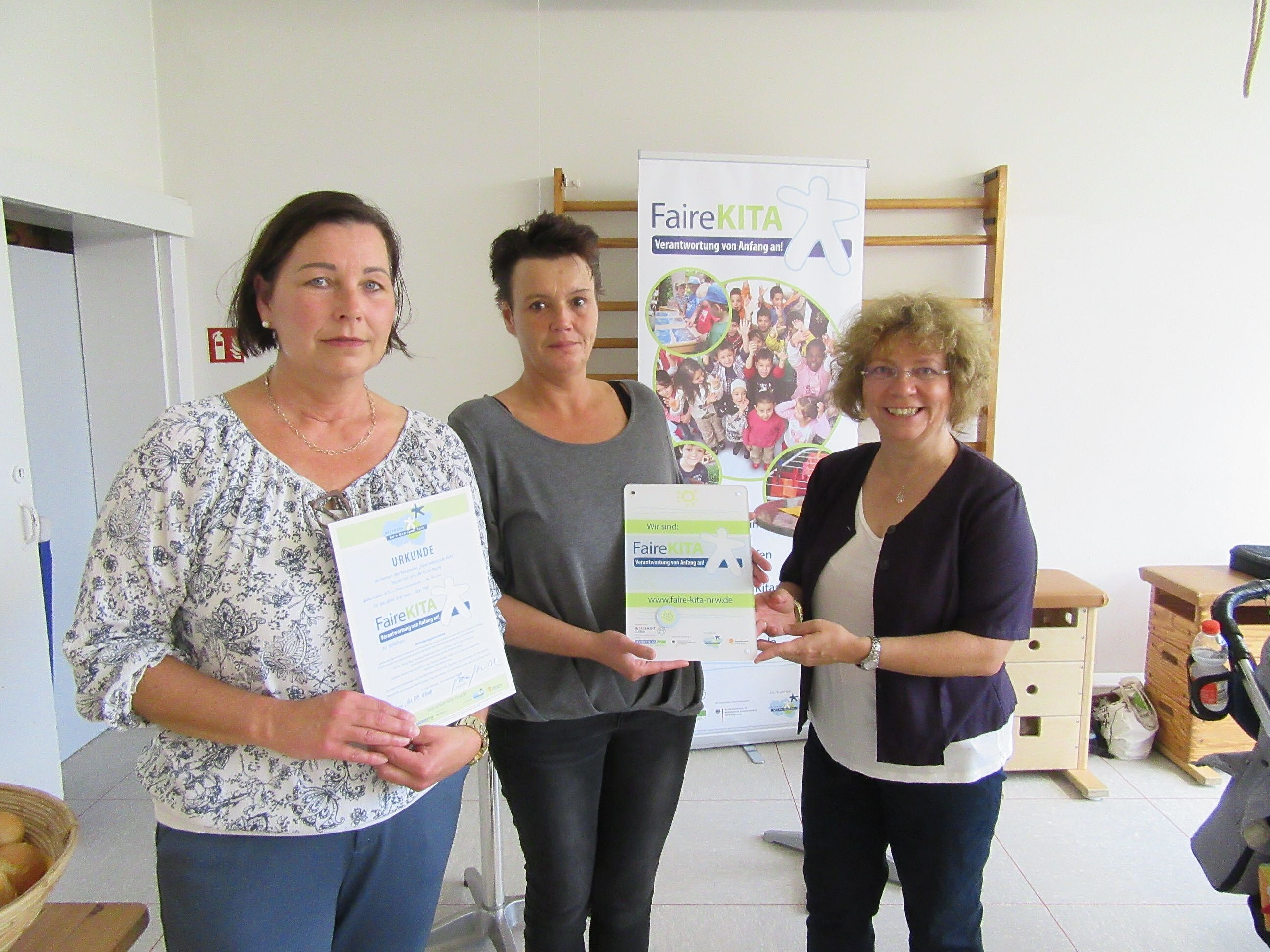 „Wir machen natürlich weiter“, so lautete die einmütige Erklärung des Teams der katholischen KiTA St. Paulus in Bochum. Die Team-KollegInnen um Anja Juncker-Vaccaro ließen sich von Petra Stach-Wittekind vom Eine Welt Zentrum rezertifizieren und nahmen eine neues Türschild und eine Urkunde entgegen, die sie bis 2021 berechtigt, den Titel „Faire KiTa“ zu führen. Die Bildungsbausteine zum Fairen Handel sowie zu einem nachhaltigen Lebensstil gehören inzwischen ganz selbstverständlich zum KiTa-Alltag dazu. Ein Tauschkoffer für Kinderkleidung hat sich bewährt und ein Repair-Café wurde gestartet. Das neue Türschild wurde mit Eltern und Kindern der KiTa bei einem gemütlichen FAIREN Frühstück gefeiert.