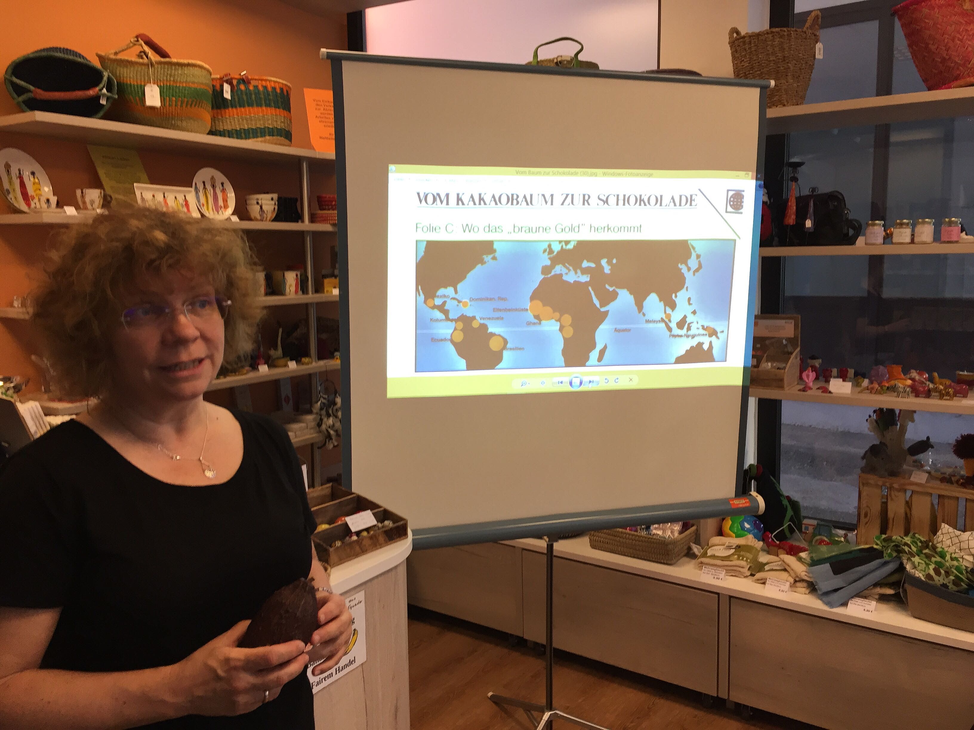 In ungezwungener Atmosphäre ging es im Weltladen Herne um das Thema Schokolade. Christa Winger und das Weltladen-Team hatten Petra Stach-Wittekind vom Eine-Welt-Zentrum zu einem Vortrag eingeladen. Anhand von Fotos und Filmsequenzen ließen sich die Gäste auf eine Reise mitnehmen. „Wo kommt der Kakao ursprünglich her? Auf welche Weise wurde er zubereitet?“, waren nur einige der Fragen, denen an diesem Abend nachgegangen wurde. Anhand des überbordenden Angebots in unseren Supermarkt-Regalen und der kursierenden Berichte über Kinderarbeit in der Kakao-Industrie suchen viele Konsumentinnen und Konsumenten nach ethisch korrekten Alternativen. Daher wurden im Zuge des Abends fair gehandelte Schokoladen vorgestellt und verkostet. Die fair gehandelten Sorten lassen keine Wünsche übrig: es gibt für die unterschiedlichsten Geschmäcker spezielle Angebote. „ Die fairen Sorten haben mir sehr gut gefallen. Die kann man gut als Mitbringsel einsetzen“, so eine Teilnehmerin.