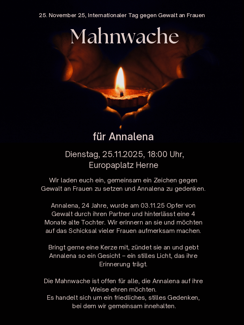 Unterstützung für Mahnwache am 25.11. in Gedenken an die getötete 24-Jährige Hernerin
