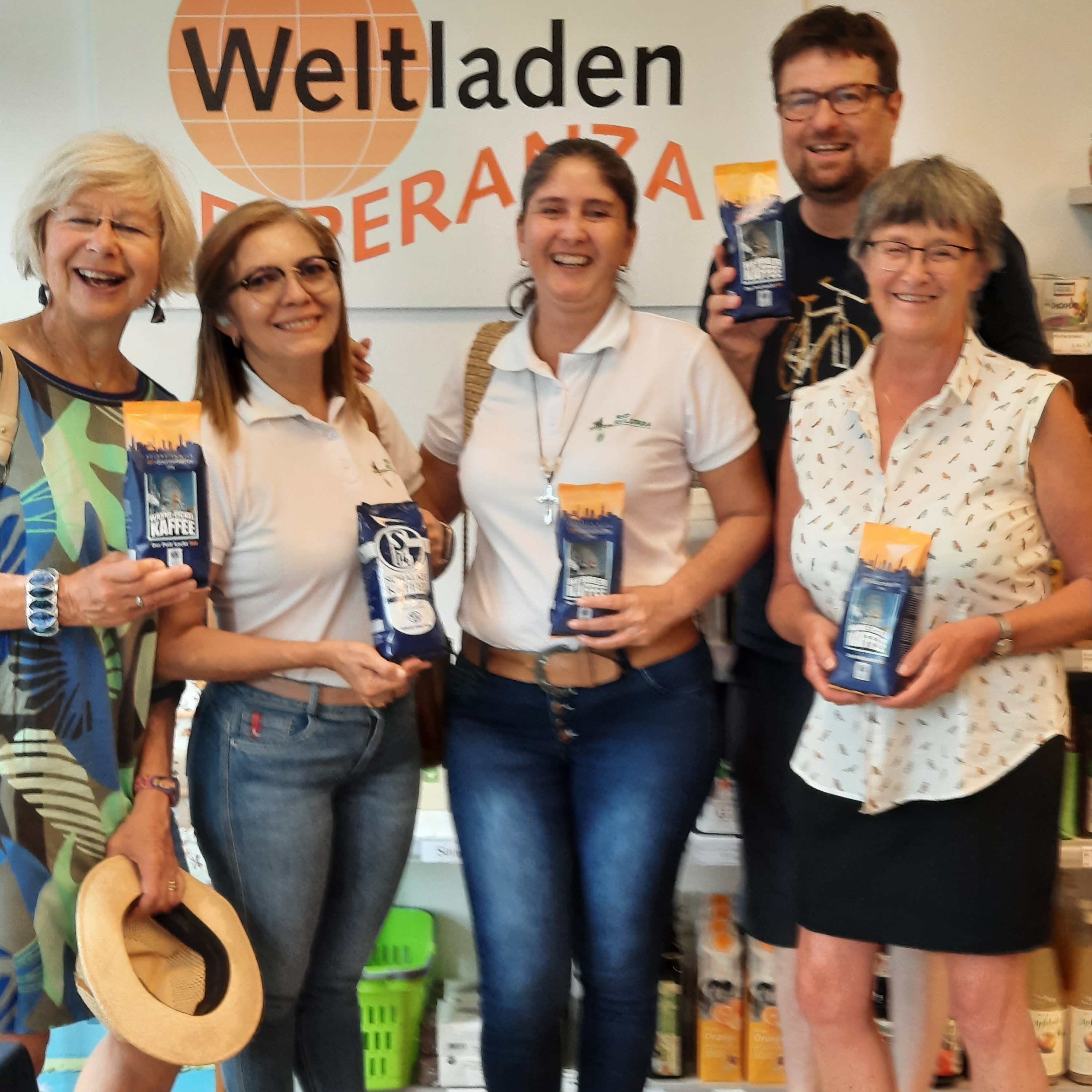 Nun gaben Mildred Niebles Jimenez und Ilba Camacho im Kontakt- und Informationszentrum der Diakonischen Stiftung Wittekindshof Einblicke in ihr Leben als Kaffeeproduzentinnen in Kolumbien. Der Faire Handel bietet ihnen viele Vorteile. So können sie z.B. mit der sozialen Prämie, in die Infrastruktur des Kaffeeanbaus investieren oder Stipendien für junge Menschen vergeben. Darüber hinaus profitieren sie von den langfristigen Lieferverträgen, der ihnen Sicherheit gibt. Sie wiesen aber auch auf einige Probleme hin. Weite und nicht befestigte Wege erschweren noch immer den Transport der Bohnen aus den Dörfern zur zentralen Sammelstelle. Sorgen macht Ihnen auch die Auswirkungen des Klimawandels. Zum einen regnet es mehr wie früher, was die Trocknung des Kaffees erschwert, andererseits müssen sie aufgrund höherer Temperaturen mit ihren Pflanzungen immer höher in die Berge. Fairer Handel und ökologischer Anbau bietet Ihnen aber die Möglichkeit, lokale Produktion in Zukunft zu sichern und dabei die Natur nicht nachhaltig zu schädigen sowie der jungen Generationen Ausbildungsmöglichkeiten anzubieten. Kaffeeanbau bleibt aber eine schwierige Aufgabe und ist schwere Handarbeit. Die Kooperative ermöglicht es dennoch auch vielen Frauen, in diesem Beruf tätig zu werden. Geschlechtergleichheit soll auch weiterhin gefördert werden. Red Ecolsierra wurde dafür als erster ländlicher Betrieb mit dem Gleichstellungspreis des kolumbianischen Arbeitsministeriums ausgezeichnet. Zum Abschluss konnten die Besucher*innen den Kaffee der Kooperative im Weltladen Esperanza probieren und mit neuem Bewusstsein genießen.
